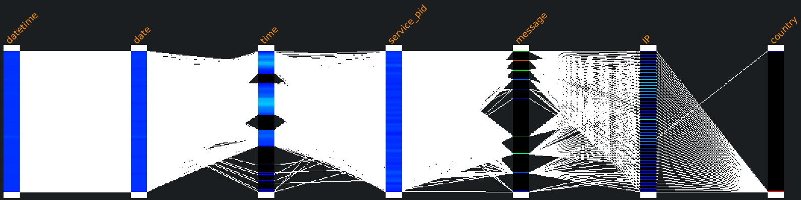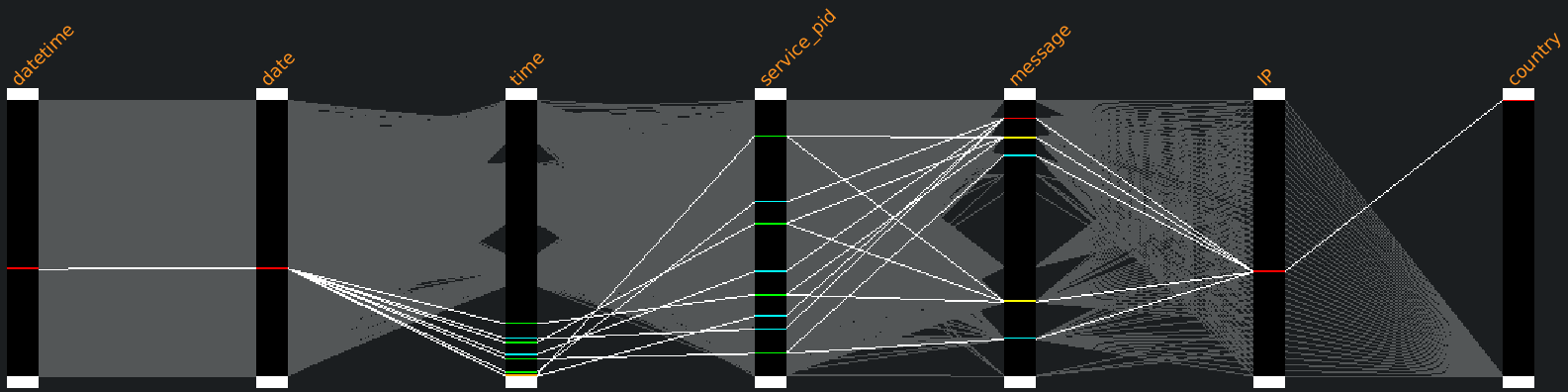 datetime column in two, to separate the date and the time.country was computed thanks to the Python API by using the IPs for the lookup.user and service) and rows that were not containing an IP address.Here is the resulting dataset (containing 2230 rows and 7 columns) loaded in Squey: