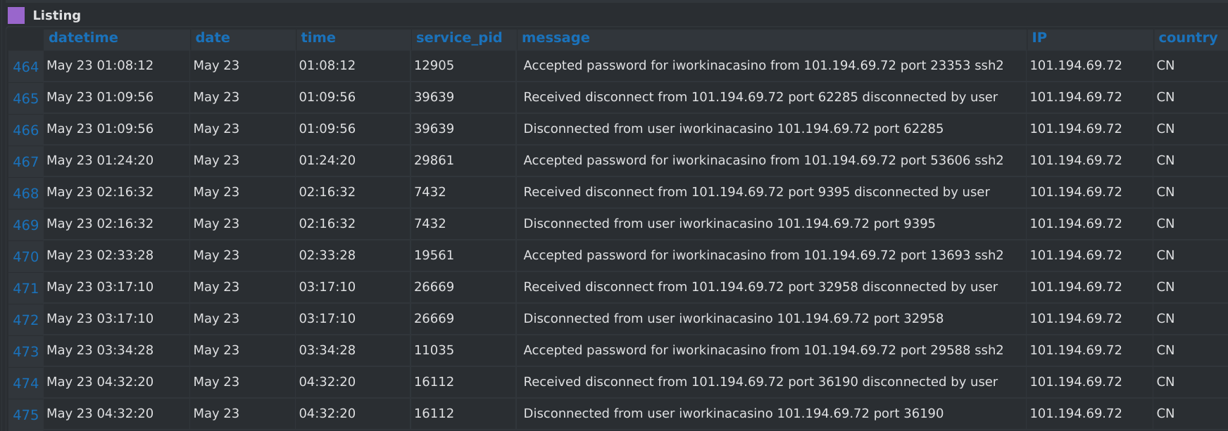Indeed, four SSH connections were issued with success from China on May 23rd between 01:08:12 and 04:32:20 :